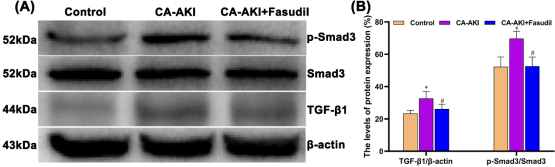 圖5 各組大鼠腎臟TGF-β1/p-Smad3信號通路中目的蛋白的表達情況