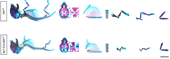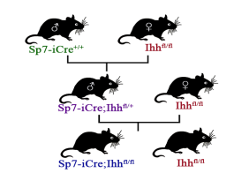 鋅指轉錄因子Sp7,也稱Osterix,是一種包含C2H2型鋅指結構的轉錄因子,在前成骨細胞向成熟成骨細胞及骨細胞的分化過程中起到至關重要的作用。通過Sp7基因表達介導Cre 的表達,主要靶向軟骨膜、骨膜及初級骨化中心的成骨譜系細胞并特異性敲除打靶的目的基因。本課題組通過Sp7-iCre轉基因小鼠(該小鼠正常發育,與野生型小鼠無異),Ihhfl/fl基因打靶小鼠交配,培育基因型為Sp7-iCre;Ihhfl/fl的基因工程小鼠,體內特異性敲除Sp7+成骨細胞中的Ihh基因,在體研究成骨細胞中的Ihh基因調控骨形成的作用并初步探究其潛在的分子機制。