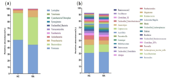 圖2 健康對照組和RA患者在門(a)、屬(b)水平上的微生物群組成