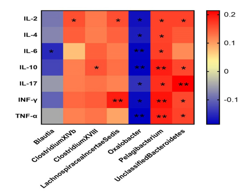 圖4 屬水平不同腸道微生物和細(xì)胞因子之間的相關(guān)性(**P<0.01,*P<0.05)