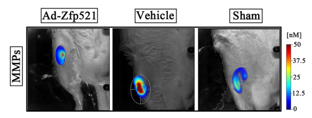 圖2. 熒光分子斷層掃描活體水平證實(shí)Zfp521有效降低大鼠膝關(guān)節(jié)炎癥水平。