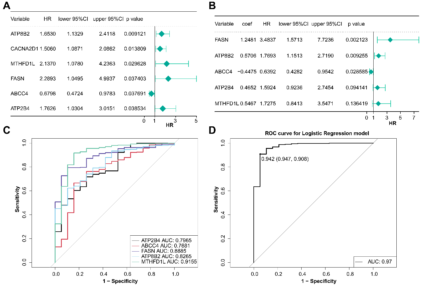 根據(jù)TCGA體細(xì)胞突變數(shù)據(jù),篩選出24個(gè)突變頻率>為3%的DEMRGs。采用單因素和多因素COX分析,鑒定出5個(gè)膀胱的預(yù)后生物標(biāo)志物(FASN、ATP8B2、ABCC4、ATP2B4、MTHFD1L)。然后我們繪制5個(gè)預(yù)后相關(guān)基因的ROC曲線(xiàn),檢驗(yàn)?zāi)P突虻念A(yù)后預(yù)測(cè)能力,結(jié)果顯示單個(gè)基因的AUC均大于0.7,但利用這5個(gè)基因構(gòu)建的預(yù)測(cè)模型,ROC曲線(xiàn)的AUC為0.97,證實(shí)了模型的有效性和準(zhǔn)確性更高,優(yōu)于單個(gè)基因的預(yù)測(cè)能力。(圖2)
