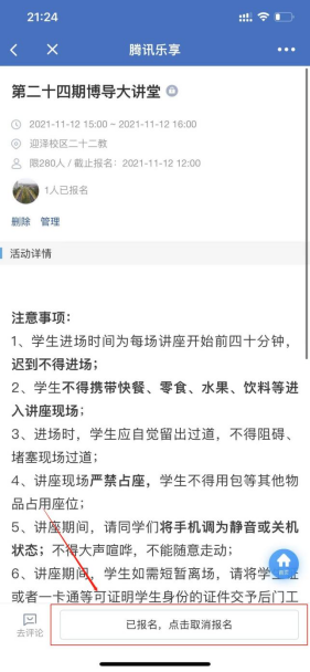 同學們到達講座現場后,須使用手機打開企業微信,在“活動預約”中找到“我的——我的活動——我參與的”,出示“已報名”界面,待工作人員確認后方可進場。