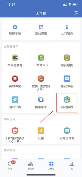 “工作臺”界面,下劃頁面,點擊“活動預約”。