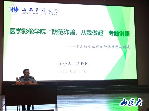在深入開展黨史學習教育之際,為進一步落實“我為群眾辦實事”實踐活動,針對當前廣大學生受電信詐騙案件高發的趨勢,為幫助學生提高防范意識、了解常見的電信詐騙種類、學習防范措施,5月27日上午,醫學影像學院邀請晉中市公安局高校分局東校區派出所副所長莊敬國,在中都校區大學生劇場開展“防范詐騙,從我做起”專題講座。醫學影像學院黨總支副書記郭曄,思想政治輔導員郭景元、李慧慧及中都校區本科生參加。