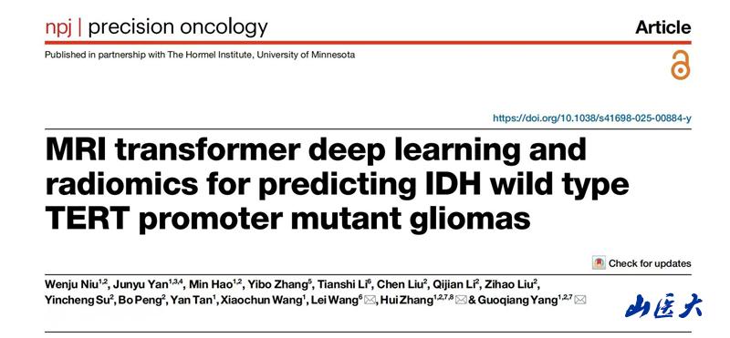 近日,我校醫學影像學院張輝教授團隊在Nature旗下子刊《npj Precision Oncology》雜志發表題為“MRI transformer deep learning and radiomics for predicting IDH wild type TERT promoter mutant gliomas”的最新研究成果。醫學影像學院2022級醫學影像技術專業本科生牛文舉為第一作者,碩士研究生閆俊羽、郝敏等為共同作者,張輝教授、楊國強副教授和首都醫科大學附屬北京天壇醫院王磊主任醫師擔任共同通訊作者。