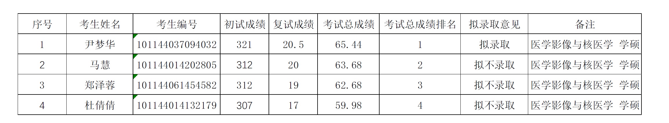 根據(jù)《c7c7.app2024年招收攻讀碩士學位研究生復試工作方案》以及c7c7.app2024年研究生招生計劃,現(xiàn)將校內調劑報考影像醫(yī)學與核醫(yī)學100207(02核醫(yī)學)考生復試結果予以公示,公示如下: