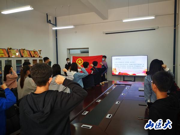 在張藝雯同學的帶領下,青年團員和學院新發展的團員面向鮮紅的中國共青團團旗高舉右拳,重溫入團誓詞。錚錚誓詞,表達了對中國共青團的擁護和報效祖國的決心,再次提醒著每一位團員要肩負起身上的責任和使命。