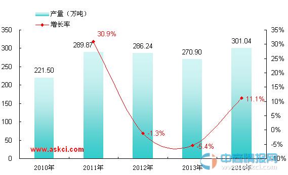 據中商產業研究院數據庫(AskCIData)最新數據顯示,2014年中國化學 藥品 原藥產量達到301萬噸,同比2013年下增長11.1%,近幾年我國化學藥品原藥行業產量情況如下圖所示: