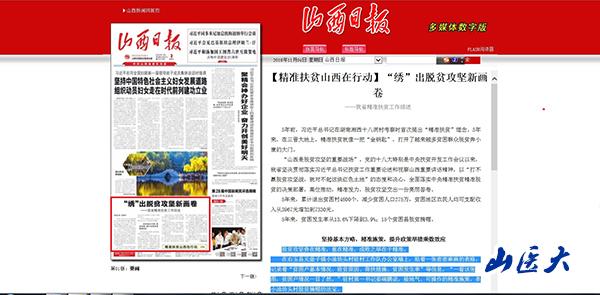 11月3日,山西日報頭版以《精準扶貧山西在行動——“繡”出脫貧攻堅新畫卷》為題,綜述我省精準扶貧工作,“山西是脫貧攻堅的重要戰場”,脫貧攻堅貴在精準,重在精準,成敗之舉在于精準。報道中使用我校扶貧干部姜瑞鵬同志扶貧工作做法作為典型案例,說明“脫貧攻堅貴在精準,重在精準,成敗之舉在于精準”。