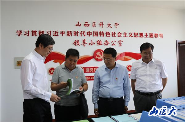 會后,校黨委副書記、學校主題教育領導小組第一副組長兼辦公室主任王宏偉同趙雙義、鮑巖巖前往學校主題教育辦公室查閱主題教育理論學習、調查研究、檢視整改等方面資料,并與工作人員交流主題教育開展情況。
